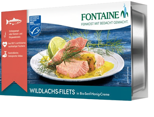 Összetevők: vadlazac-filé (60%) – Oncorhynchus gorbuscha – *mustár (13% – víz, *sárga mustármag, *szeszecet, *tengeri só, *barna mustármag, *fűszerek, *kerti fűszernövények), víz, *napraforgóolaj, *nádcukor, *méz (2%), *szeszecet, *tengeri só, sűrítőanyag: *guargumi, *kapor.