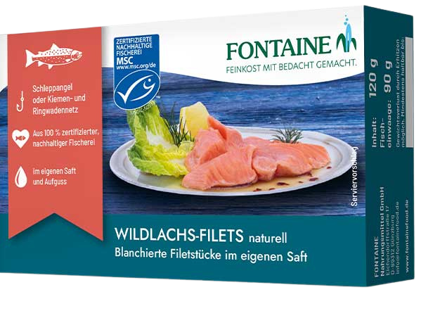 A fenntartható halászat egyben a kiváló halminőséget is garantálja. A FONTAINE vadlazacfilék kizárólag fenntartható halászatból származó, gondosan válogatott lazacokból készülnek. Mivel a vadlazac természetes táplálékon él, a halfilé színe a világostól a vöröses árnyalatig változhat.