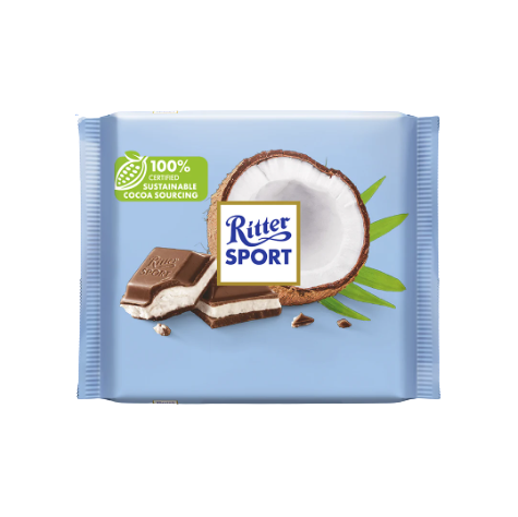 Összetevők: cukor, pálmazsír, kakaómassza, reszelt kókuszdió (9 %), teljes tejpor, kakaóvaj, sovány tejpor,laktóz (tejből), tejzsír (tejből), kókusztej (0,8 %), rizsszirup, emulgeálószer: lecitinek (szója).