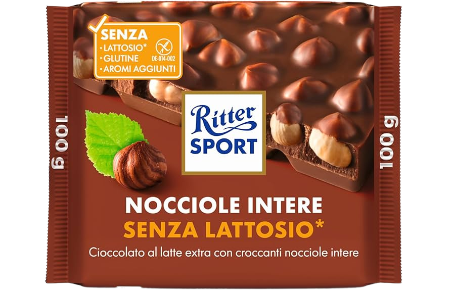 Laktózmentes*, gluténmentes tejcsokoládé egész mogyoróval (23 %).